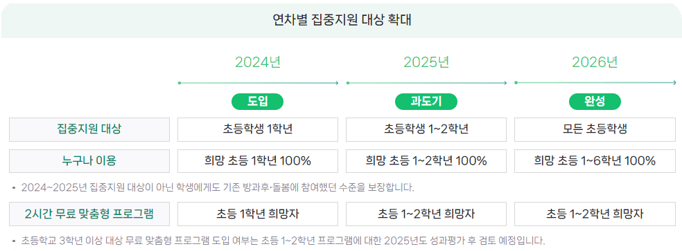 초등학생 희망자 100% (연차별 확대) (2024년) 초1학년 100% (2025년) 초1~2학년 100% (2026년) 초 1~6학년 100% |