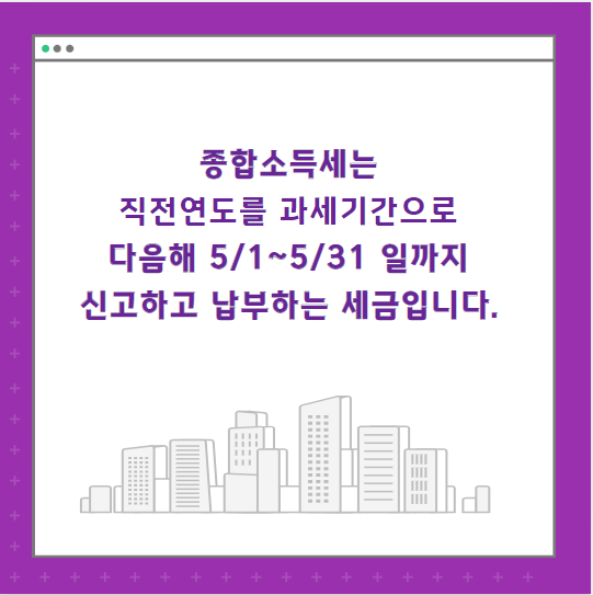 종합소득세는 직전연도를 과세기간으로 다음해 5/1~5/31 일까지 신고하고 납부하는 세금입니다.