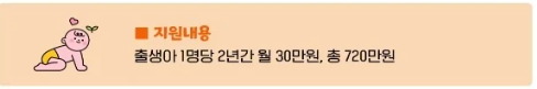 출생아동 및 입양아 1명당 매월 30만 원씩 2년간 총 720 만원 을 지원받게 됩니다.