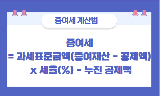 증여세= 과세표준금액(증여재산 - 공제액) x 세율(%) - 누진 공제액