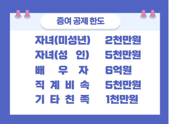 가족 간에 10년 단위 로 부부간은 6억원, 성인자녀는 5000만 원 , 만 19세 미만 미성년자는 2000만원 까지 증여세 대상에서 제외됩니다.