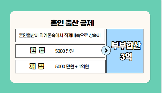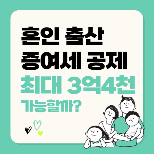 º 신설되는 혼인 증여공제와 출산증여 공제를 합해서 증여세가 면제되는 공제한도 금액은 1억원입니다.